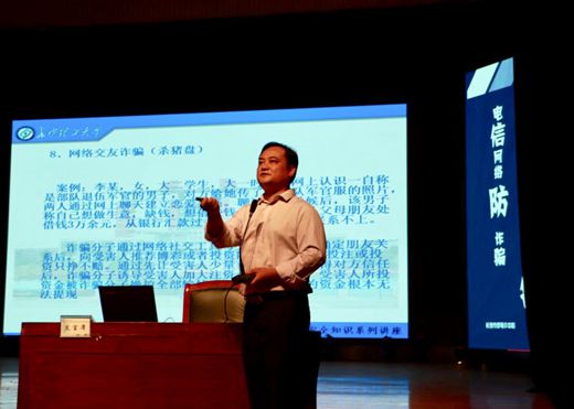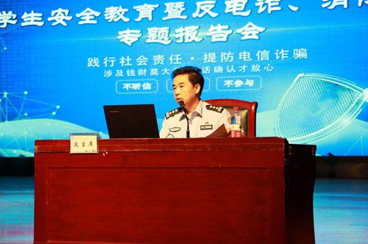 伍接朝以“提升安全防范意识,维护生命财产安全”为题,用学生身边发生的各类安全事件的真实案例,分享了如何做好治安防范、如何增强消防安全意识和避免其他安全问题;系统介绍了校园高发的偷盗、扒窃和诈骗案件类型、作案方式、作案地点以及预防策略。重点介绍了校园诈骗案件的种类、作案手法和如何鉴别与预防。他总结了“6个一律”“8个凡是”,提醒全体师生不贪小利、不生投机心理,不将个人信息透露给别人,不轻易汇款或借钱给他人,遇事先冷静三分钟;结合火灾案例,特别是发生在我校的消防事故,介绍了校园易发的消防安全事件类型、产生原因、如何避免以及逃生技巧。