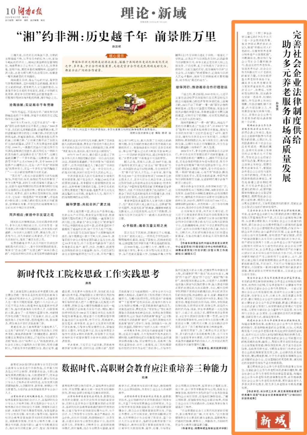 近日,长沙理工大学法学院讲师孙亚贤的理论文章《完善社会企业法律制度供给助力多元养老服务市场高质量发展》在《湖南日报》“理论·新域”版发表。