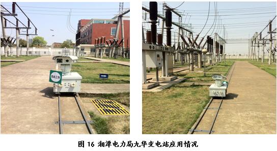 根据变电站布置铺设轨距宽25厘米、轨面宽1.8厘米的简易轨道或在道路中央埋设电缆电磁轨道(单根电缆,电压48V,电流3A,频率5000HZ),机器人携带红外热像仪、可见光CCD、噪声传感器等检测装置,以自主和遥控方式沿轨道运行,全天候地完成高压变电设备的巡检,并通过无线和有线网络,将有关数据传送集控中心进行分析、处理,以便及时发现事故隐患和故障先兆。与磁轨迹式机器人相比,具有移动速度快、定位准确、成本低、可靠性高的特点。项目的主要功能有:电力设备远程红外测温成像,最大距离120米;刀闸状态的自动识别与校验;及时发现电力设备外部机械或电气问题,例如异物、损伤 、漏油等,移动物体闯入的监测与报警;变压器、电抗器噪声监测;绝缘子污秽的红外成像检测、分析;电力设备的自动、手动与定点巡检;机器人自动充电。项目已在河南南阳电力局所属西峡电业局、淅川电业局,湖南湘潭电力局的35KV、110KV、220KV变电站投入应用,目前效果良好。