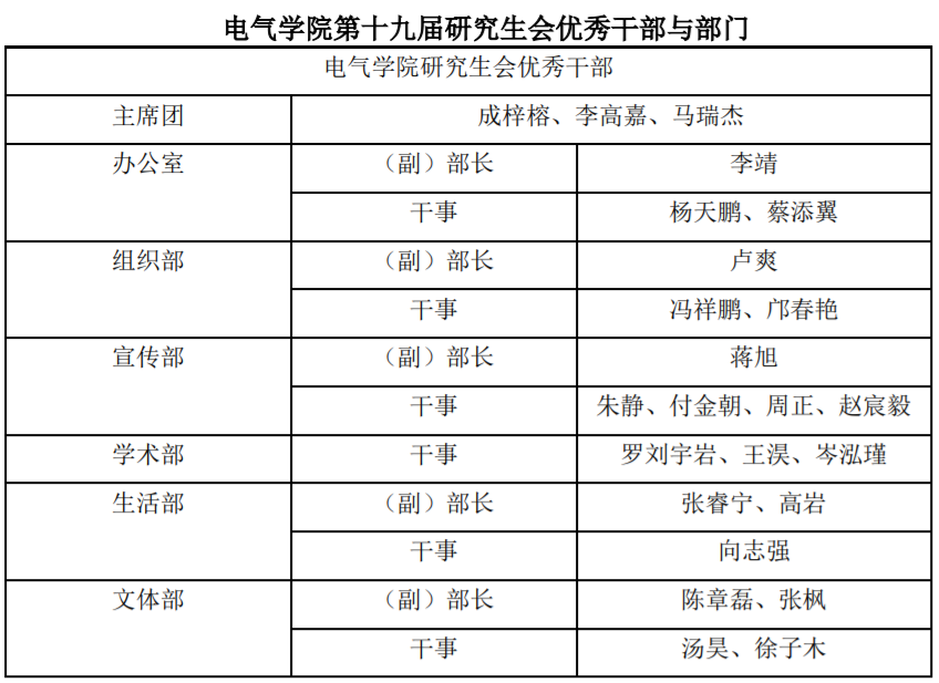 本着“公平,公正,公开,择优录取”的原则,在电气学院学生工作办公室的监督和指导下,通过个人申报、现场竞选发言、选举投票等程序,最终确定了电气学院第十九届研究生会优秀干部与部门以及第二十届研究生会成员名单,现公示如下: