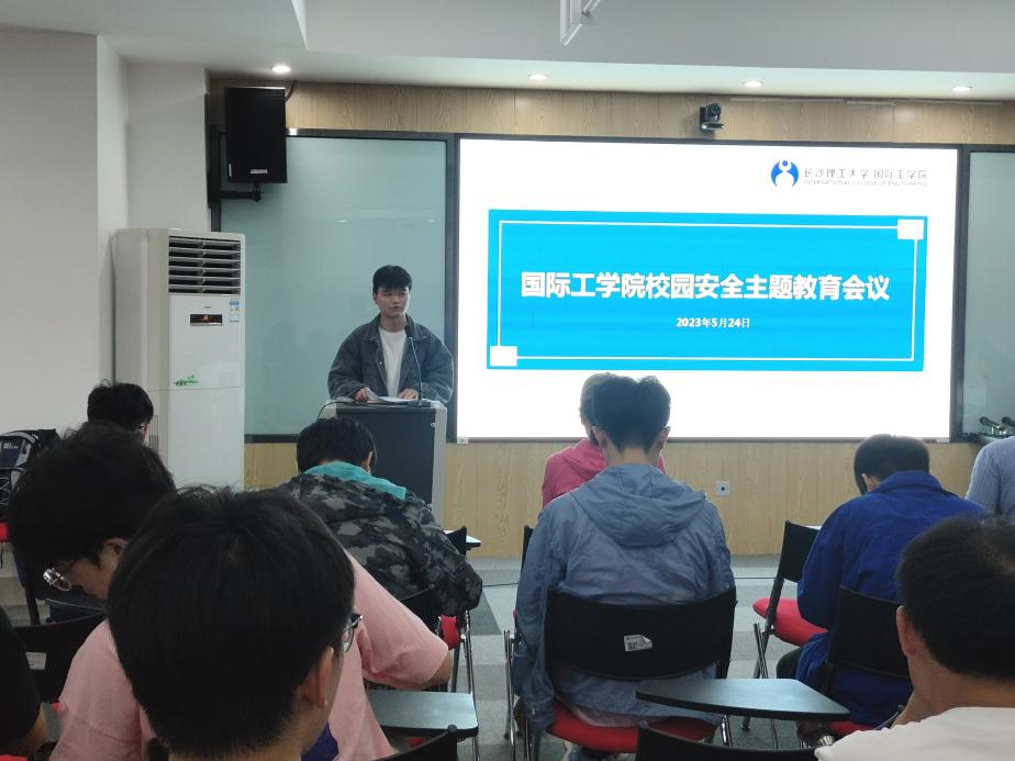 5月24日晚,国际工学院召开校园安全主题教育会议。学院党总支副书记兼副院长乔法光、辅导员魏涛、全体班长参与此次会议,会议由魏涛主持。