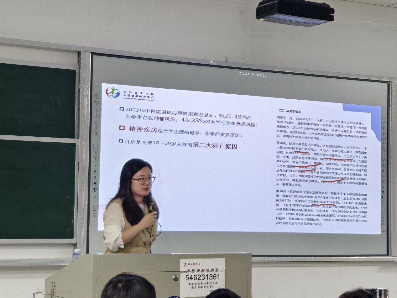 为提高朋辈心理互助能力,加强学生心理素质,培养学生健全人格,4月17日晚,计通学院在金盆岭6-312教室举行了2023级朋辈心理互助员上岗培训班开班仪式,长沙理工大学心理健康教育中心曾玮怡担任第一讲面授教师,23级辅导员刘洋主持,23级全体心理委员、寝室长、学生骨干参加。