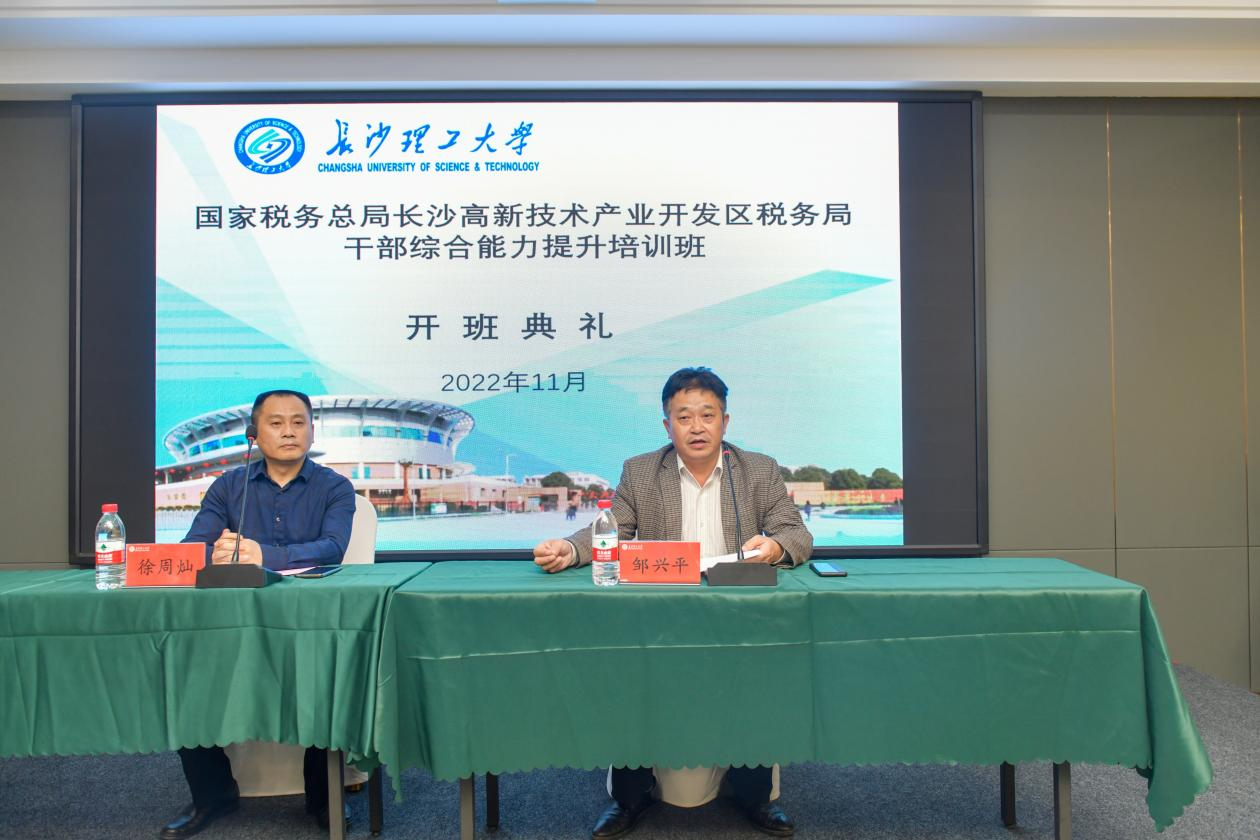 2022年11月21日,由国家税务总局长沙市税务局委托我校承办的 “长沙高新技术产业开发区税务局干部综合能力提升培训班”,在长沙理工大学正式开班。国家税务总局长沙高新技术产业开发区税务局党委委员、副局长徐周灿同志、长沙理工大学继续教育学院院长邹兴平教授参加了本次开班仪式。