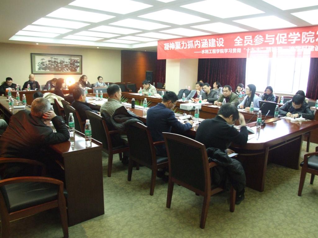 船的力量在帆上,人的力量在心上!学院面对日益激烈的竞争,面临制约发展的各种难题,为凝神聚力全力以赴狠抓学院内涵建设,号召并鼓舞全院教职工投身到学院发展的大计中来,在克服下雪、道路冰冻等极端恶劣天气的情况下,2018年1月27日水利工程学院在云塘校区国际学术交流中心多功能报告厅举行学习贯彻“十九大”精神暨一流学科建设研讨会。校党委书记付宏渊、副校长蒋昌波、学院退休教师代表、学院全体教职员工共计96人出席了此次研讨会。研讨会由学院党委书记喻玲娜主持。