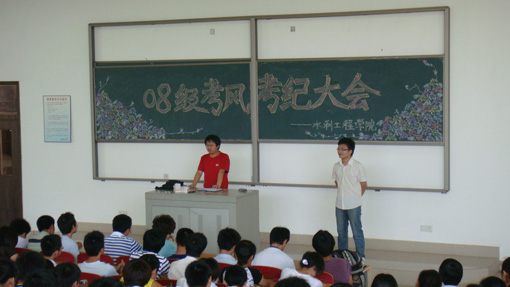 6月18日上午10:00,水利工程学院在综合楼B-202召开了关于考风考纪的年级大会,08级的全体学生参加了此次大会,会议由08级辅导员王学成老师主持。