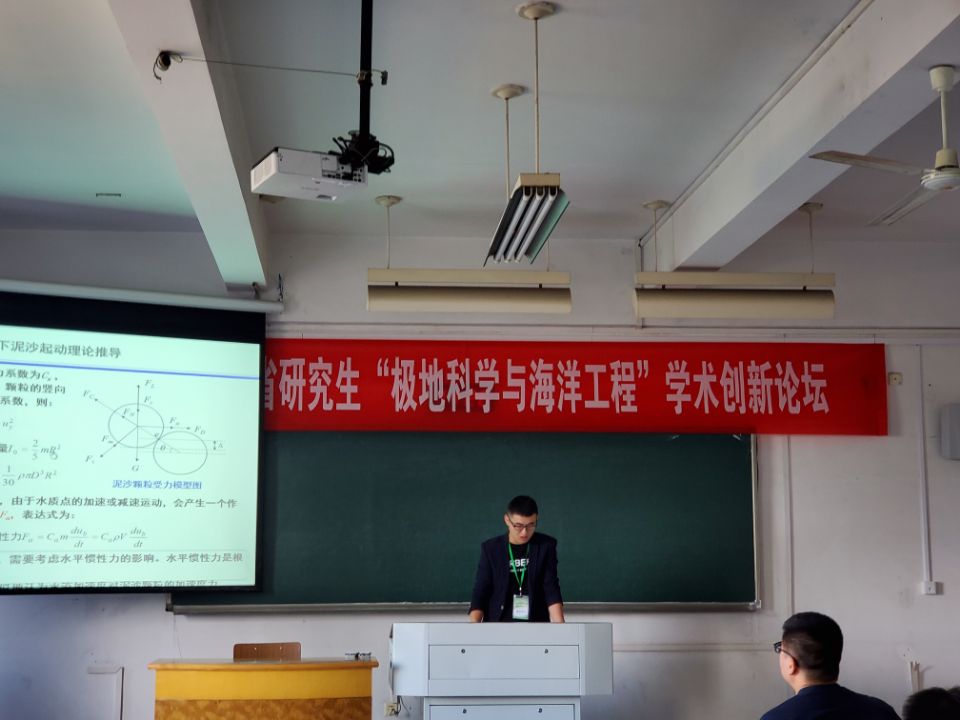 在研究生创新论坛上,我院硕士研究生肖宇做了题为“海啸波作用下挡板式防波堤防灾减灾的实验研究”学术报告,我院硕士研究生童忠武做了题为“非恒定流下泥沙起动分析研究”学术报告,我院硕士研究生姚震做了题为“研究工程建设对海洋环境影响分析-以鱼山大桥为例”学术报告,我院硕士研究生龚尚鹏做了题为“潮间带植物概化模型的消波实验研究”学术报告,我院硕士研究生毛宇奇做了题为“潮间带植物概化模型的消波实验研究”学术报告,我院硕士研究生陈克伦做了题为“刚性植物根部对规则波的流速传播及边界层发育情况影响研究”学术报告。
