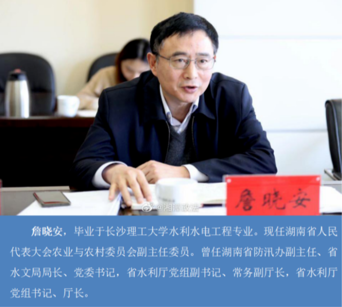 詹晓安,毕业于长沙理工大学水利水电工程专业。现任湖南省人民代表大会农业与农村委员会副主任委员。曾任湖南省防汛办副主任、省水文局局长、党委书记,省水利厅党组副书记、常务副厅长,省水利厅党组书记、厅长。