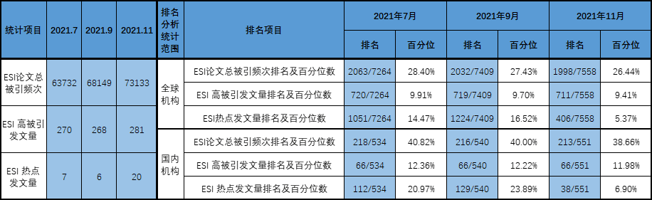 本期我校ESI热点发文量在全球7558个机构中,排名第406;在国内551个机构中,排名第38。