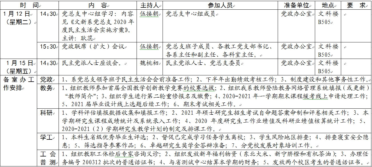 文新系2020-2021学年度第一学期第十九周工作安排表