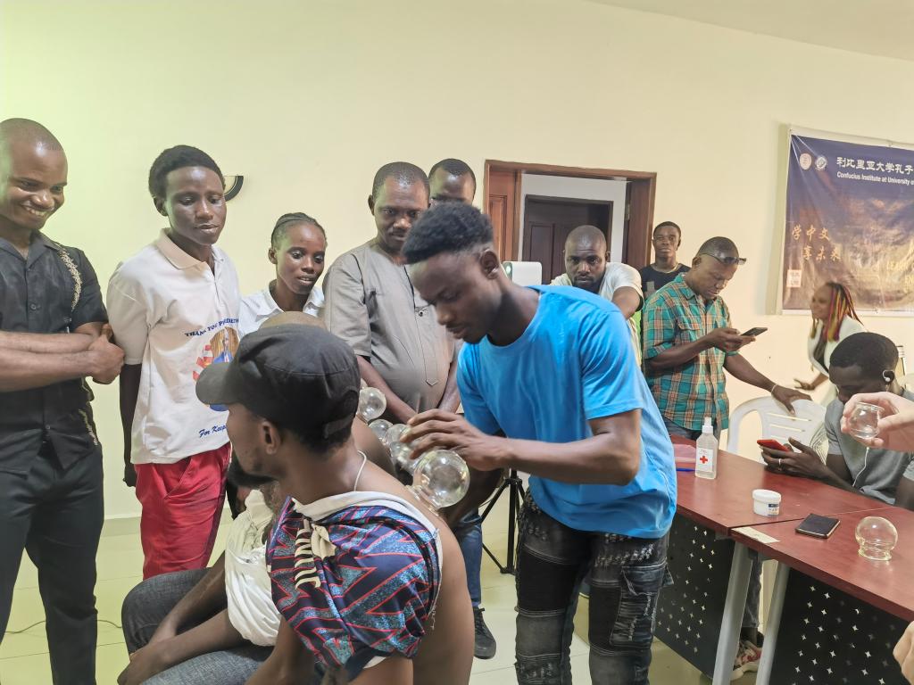 当地时间2022年11月12日,利比里亚大学孔子学院与第15批援利医疗队在孔院驻地多媒体功能厅联合举办的中医拔罐疗法培训班成功开班。利大孔院全体教师及慕名报名学习中医拔罐技术的孔院学生共四十余人参加了首次培训活动。