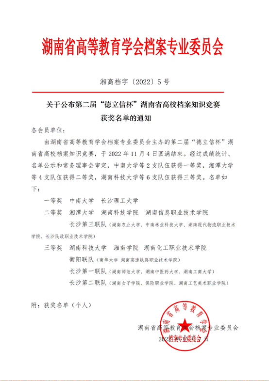 2022年11月4日,由湖南省高等教育学会档案专业委员会主办,湖南德立信科技发展有限公司承办的第二届“德立信杯”湖南省高校档案知识竞赛成功在线举办,我馆张奎、何潘毅、钟敏雄、李满艳四位老师代表档案馆参加了此次竞赛,并获得团体一等奖。